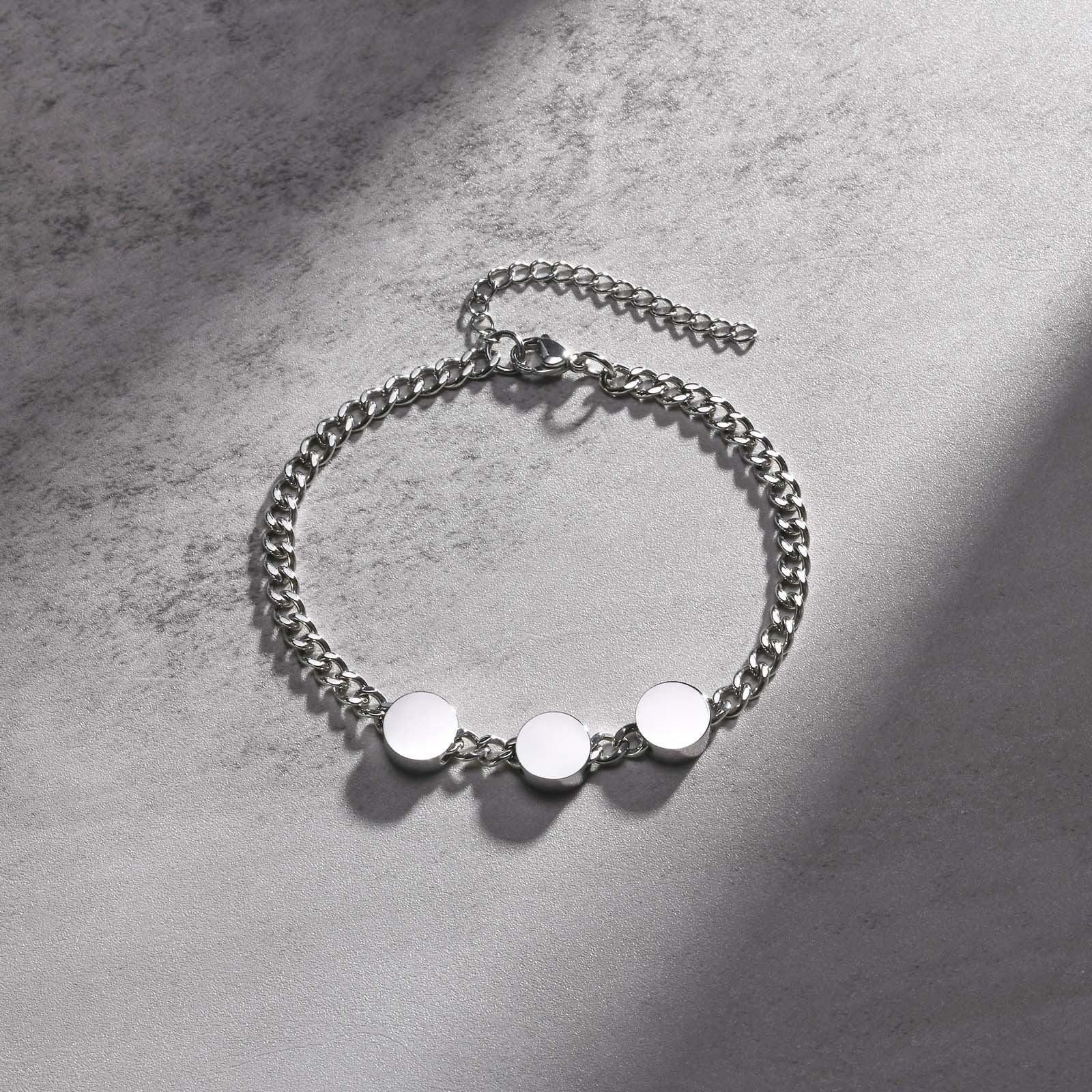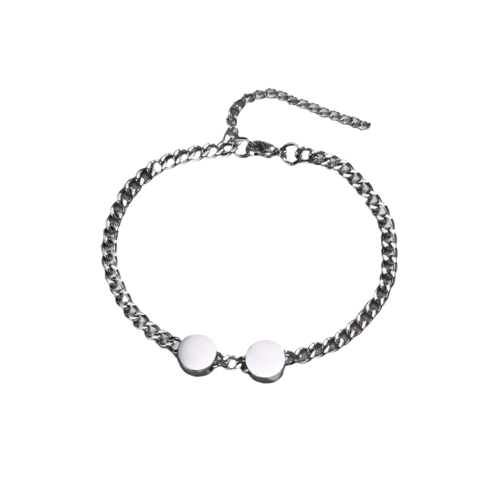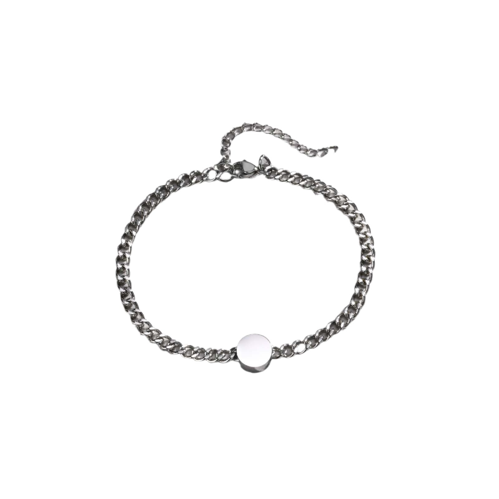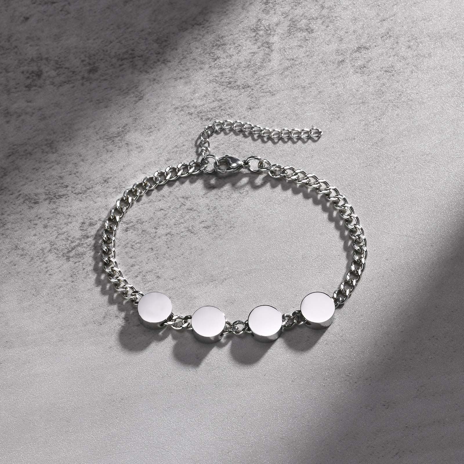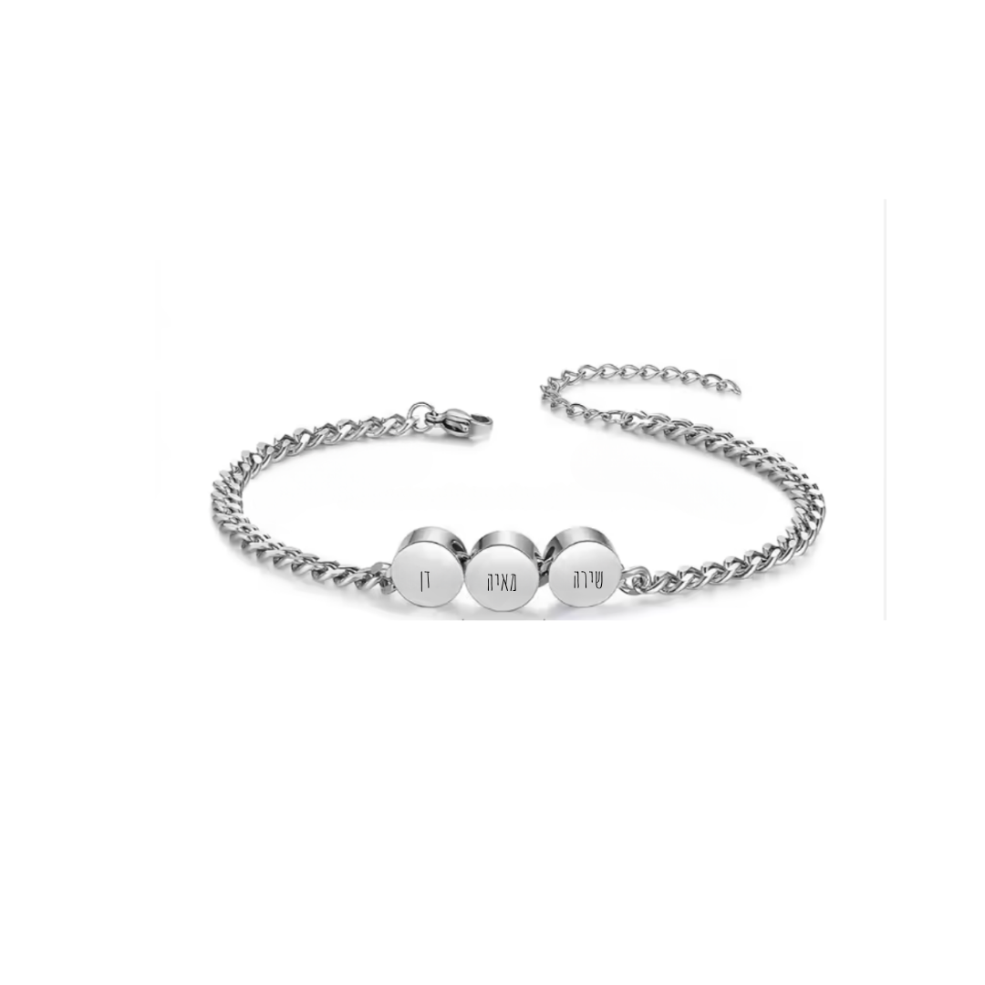 צמיד גברי מעוצב בסגנון גורמט עם צ'ארמים עגולים המיועדים לחריטה אישית. מושלם לגבר שרוצה להוסיף נגיעה אישית ומיוחדת למראה שלו.